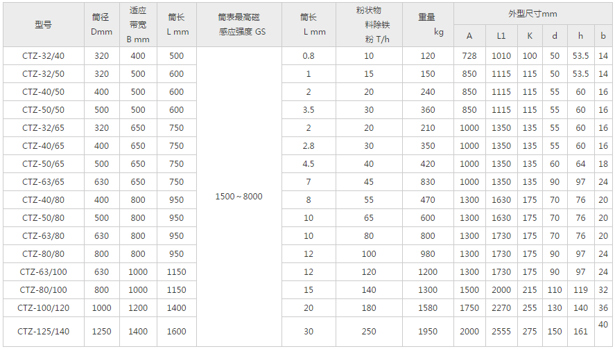 CTZ型中場強(qiáng)半磁滾筒(CTZ型中場強(qiáng)全磁滾筒結(jié)構(gòu)與RCT型參數(shù)等同),多用于對(duì)粉狀、顆粒狀、小塊狀物料的凈化處理,或?qū)﹁F質(zhì)的回收利用,對(duì)防止研磨機(jī)、壓榨機(jī)的破壞和磨損起著可靠的保護(hù)作用。它安裝方便、吸力強(qiáng)、低能耗、連續(xù)工作、操作簡單。
