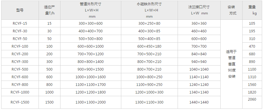 RCYF型垂直管道式永磁除鐵器適用于水泥、建材、化工、糧食、塑料、煤炭、耐火材料等行業的粉狀、顆粒狀、塊狀物料的除鐵,可與輸送管道連接,垂直安裝使用。