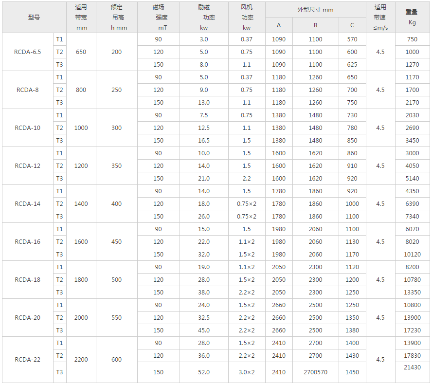 RCDA-T型強風冷式電磁除鐵器內部磁路設計獨特,透磁深,吸力大,吸力遠大于國標除鐵器。軸流式風機強迫風冷,風量大,使除鐵器散熱快、溫升低,保障除鐵器無故障長期工作。